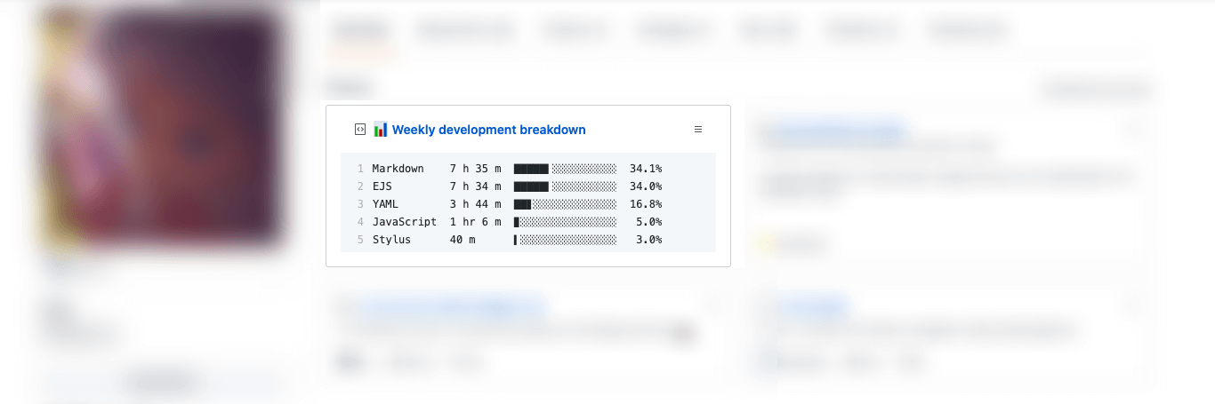 async function updateGist(stats) { /* ... */ // line - 28 const lines = []; for (let i = 0; i < Math.min(stats.data.languages.length, 5); i++) { const data = stats.data.languages[i]; const { name, percent, text: time } = data; // 内容格式 const line = [ name.padEnd(11), time .replace(/hrs/g, "h") .replace(/mins/g, "m") .padEnd(9), generateBarChart(percent, 16), String(percent.toFixed(1)).padStart(5) + "%" ];